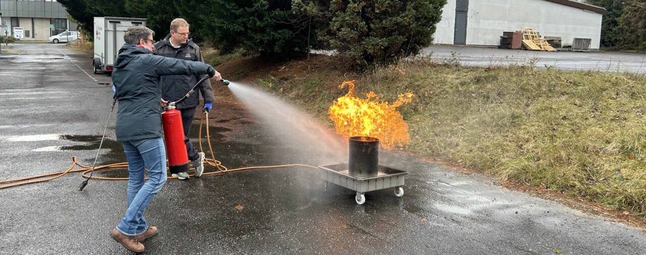 Im abschließenden praktischen Teil wurden Feuerlöschübungen an einer Simulationsanlage durchgeführt, um die Handhabung von Feuerlöschgeräten und den Einsatz von Feuerlöschtaktiken zu üben.