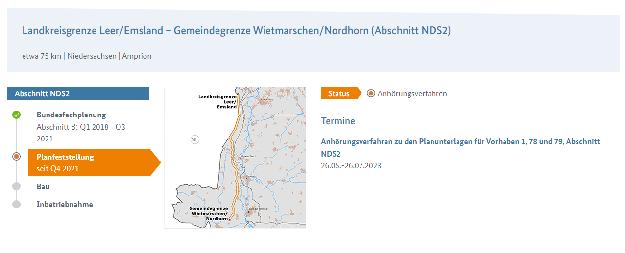 Die Bundesnetzagentur leitete anschließend den nächsten Verfahrensschritt – das Anhörungsverfahren nach § 22 NABEG – ein. Die Bekanntmachungen hierzu wurden Mitte Mai 2023 in den örtlichen Tageszeitungen, die in dem Gebiet verbreitet sind, auf das sich das Vorhaben voraussichtlich auswirken wird, geschaltet. Die Antragsunterlagen wurden dann ab dem 26. Mai 2023 für die Dauer von einem Monat auf der Internetseite der Bundesnetzagentur (s. untenstehende Links) ausgelegt. Die Frist für Stellungnahmen und Einwendungen endet am 26. Juli 2023. Die Erörterungstermine finden voraussichtlich im November und Dezember statt. Der Planfeststellungsbeschluss wird im zweiten Quartal 2024 erwartet.