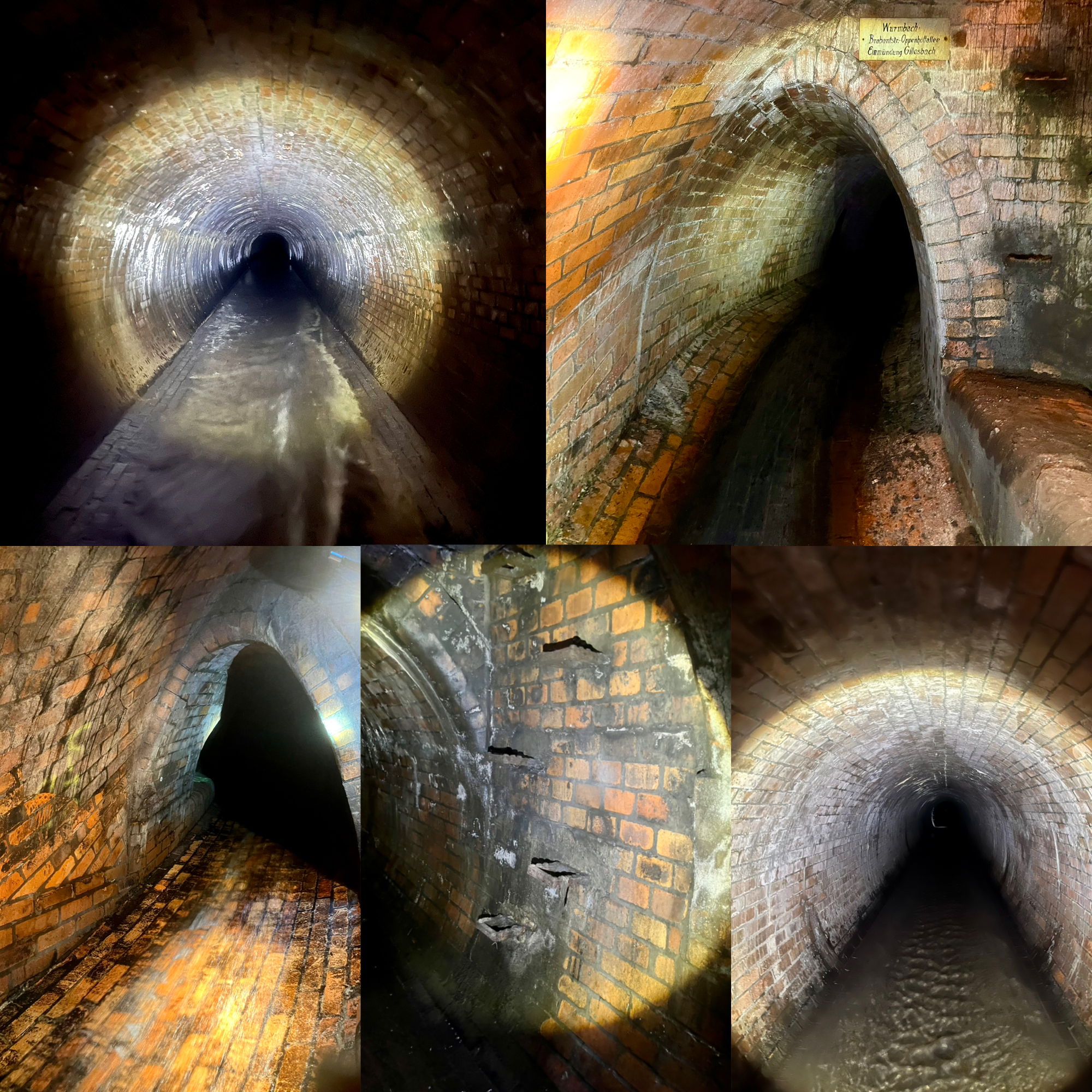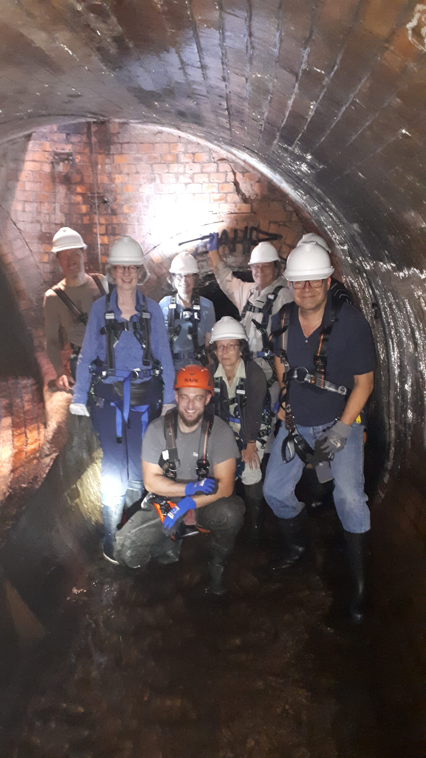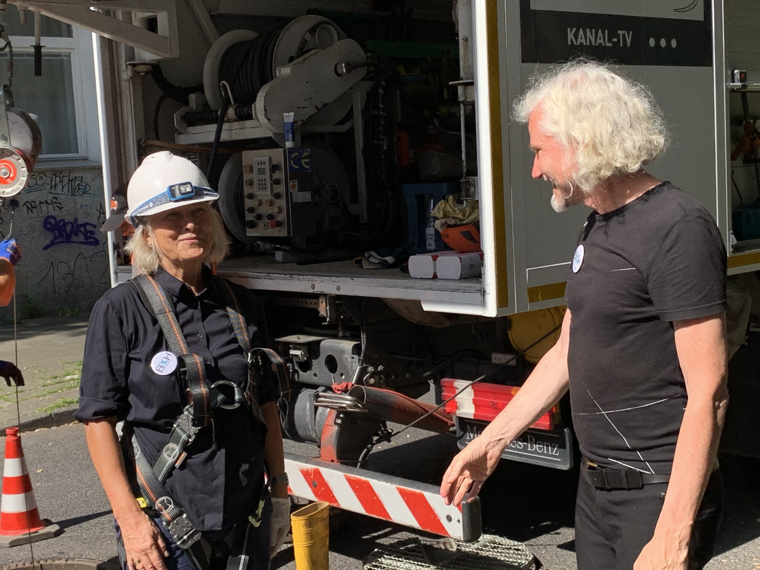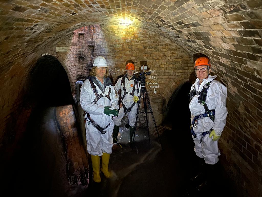 Nicht ganz so alt und dennoch kaum bekannt, aber nicht minder spannend ist der gut 120 Jahre alte, in ca. 3 Meter Tiefe liegende, geklinkerte Wurmbachkanal unterhalb der Brabantstraße zwischen Oppenhoffallee und Luisenstraße, der im Rahmen des Tags des offenen Denkmals besichtigt werden konnte. Die Projektgruppe „Aachener Bäche ans Licht“ hat dies zusammen mit der Regionetz für 70 Personen möglich gemacht, viele andere gingen leider leer aus, denn das Interesse war groß. Doch nicht nur die Aachener Zivilbevölkerung interessiert sich für ihre Bäche, auch Oberbürgermeisterin Sibylle Keupen und Stadtbaurätin Frauke Burgdorff ließen sich die Besichtigung nicht entgehen. Beide sind wichtige Unterstützerinnen für das Projekt, freut sich Helmut Berg, der den Besuchern nach ihrem Aufstieg aus der Unterwelt die weitergehenden Pläne zu Offenlegung und Erlebbarmachung der Aachener Bäche präsentierte.