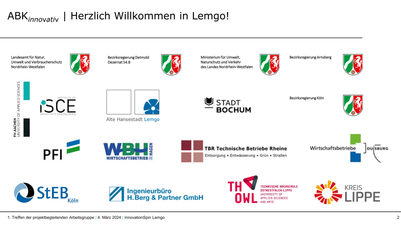 Am 4. März 2024 fand die erste Sitzung der projektbegleitenden Arbeitsgruppe im InnovationSpin in Lemgo statt. Mitglied der Arbeitsgruppe sind neben der Alten Hansestadt Lemgo weitere Kommunen von Rheine bis Köln, übergeordnete Behörden wie der Kreis und die Bezirksregierungen sowie verschiedene Landesministerien. Als Sachverständige vom Ingenieurbüro H. Berg & Partner GmbH ist Geschäftsführerin und Fachbereichsleiterin „Kanalsanierung & -kataster“, Dipl.-Ing. Petra Heinrichs-Stalitza, dabei. Die wissenschaftliche Begleitung erfolgt durch das Institute of Smart City Engineering (ISCE) der FH Aachen.