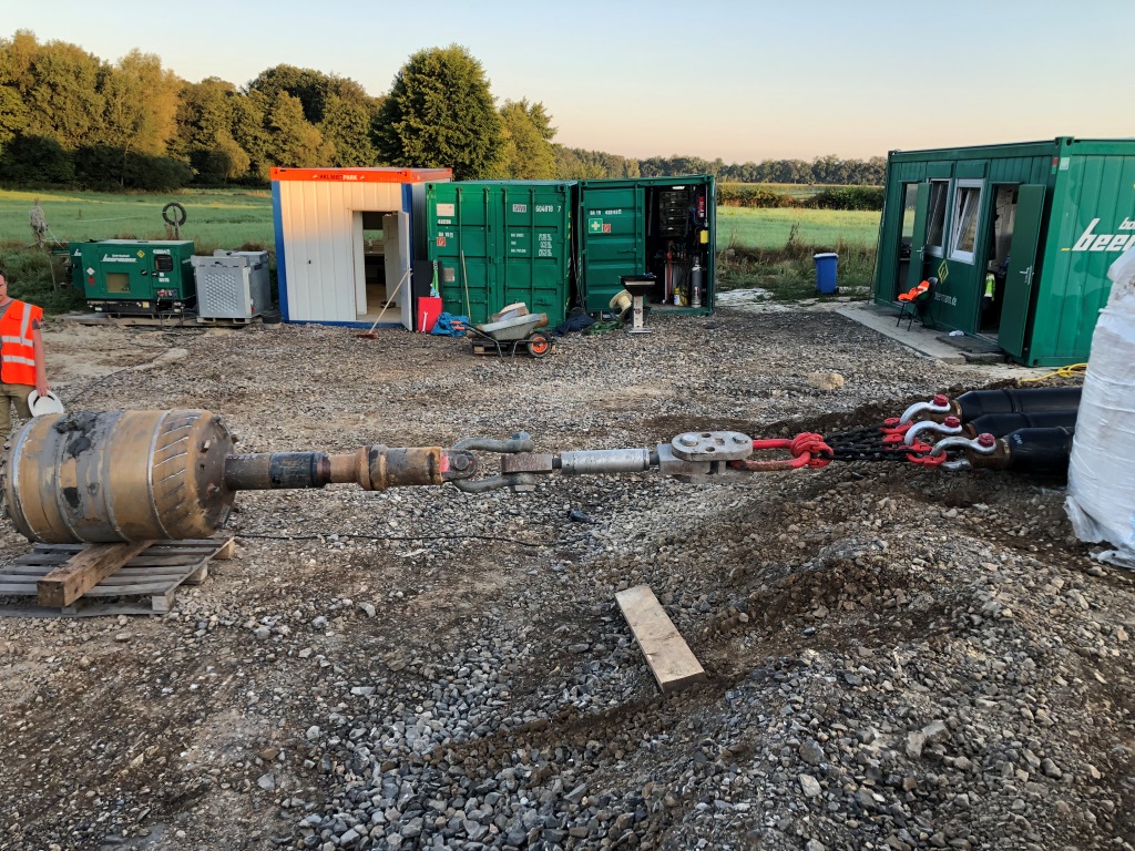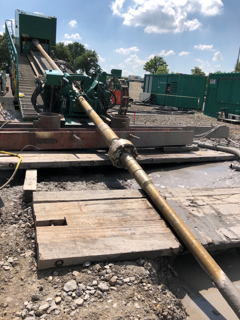 Von nun an bohrten zwei Bohranlagen zeitgleich mittels Bohrmotor und Kreiselkompass ergänzt um eine Radarortung unter höchster Präzision aufeinander zu (Intersect-Methode). Am 27.06.2019 trafen sich die beide Pilotbohrungen zielgenau. Anschließend mussten zwei weitere Aufweitvorgänge des Bohrloches ausgeführt werden. Zunächst wurde der Bohrkanal auf 650 mm mit Hilfe eines PDC-Meißels aufgeweitet.