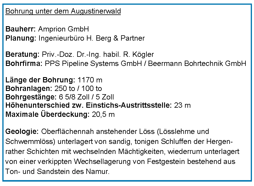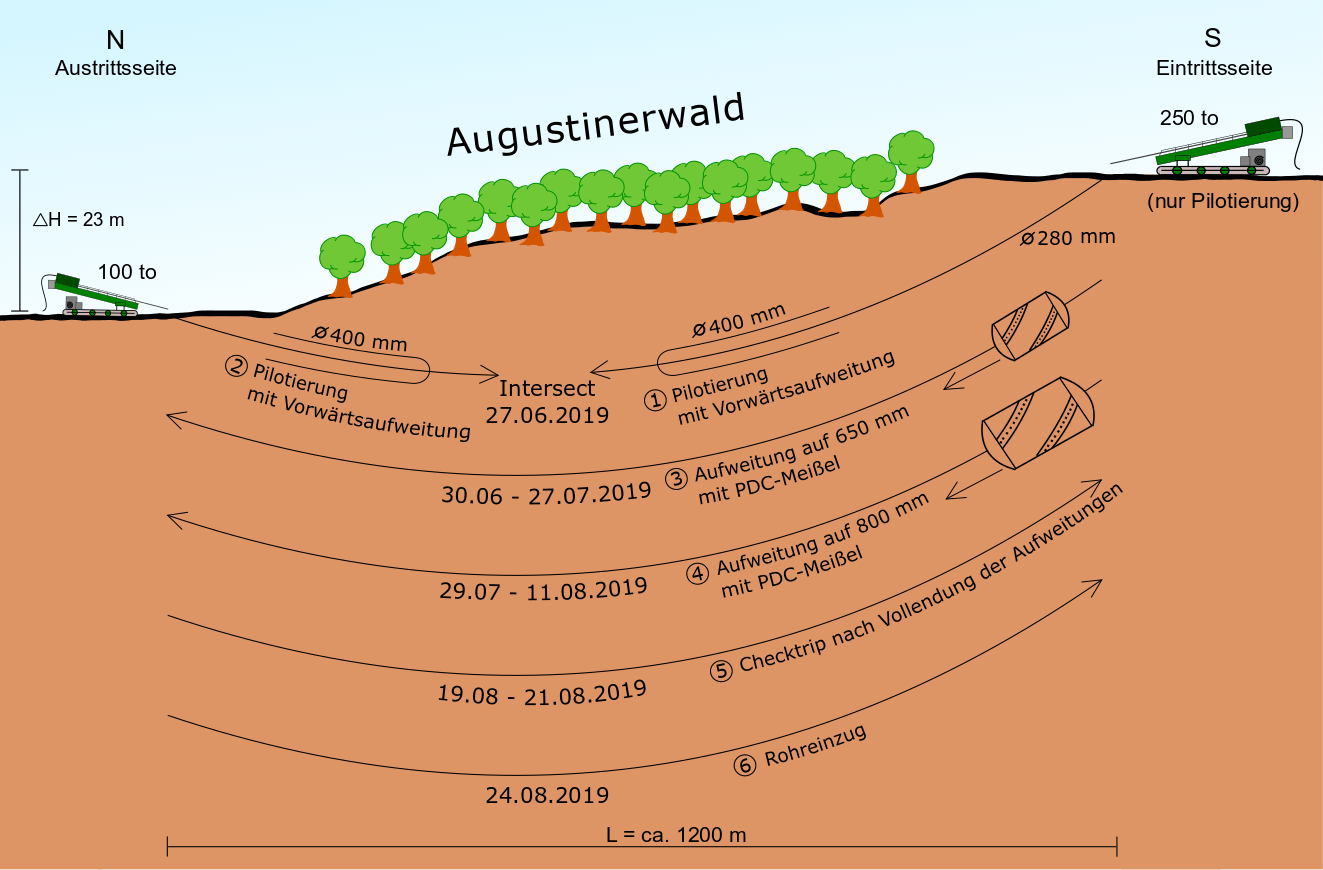 Die Bohrung unter dem Augustinerwald begann im Mai 2019. Das HDD-Verfahren wird bei einer Vielzahl von Leitungsbauprojekten aufgrund der oberflächenschonenden Verfahrensweise zur Querung vorhandener Infrastrukturen und zum Erhalt schützenswerter Naturräume eingesetzt. Häufig findet es Anwendung bei Längen von einigen hundert Metern. Die Länge der Bohrung unter dem Augustinerwald beträgt hingegen fast 1.200 m – in der anstehenden Geologie und dem zu verwendenden Rohrwerkstoff Kunststoff eine Herausforderung. Hinzu kommt ein Höhenunterschied von rund 23 m zwischen der Nordseite (Austrittsstelle) und der Südseite (Eintrittsstelle) der Bohrung.