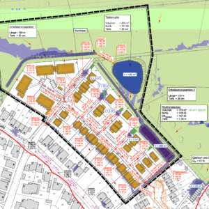 LP 1-3, 5-7 für Verkehrsanlagen, LP 1-7 für Ingenieurbauwerke (Kanal und Hausanschlüsse), Örtliche Bauüberwachung, Niederschlags-Abflussmodelle für 30-, 50- und 100-jähliche Starkregenereignisse, Koordination Versorgungsunternehmen, Koordination Nahwärmenetz über Blockheizkraftwerk