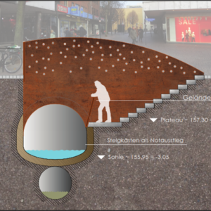 Projekt: Um die Aufenthaltsqualität zu verbessern und das Stadtbild interessanter zu gestalten, soll an ausgewählten Standorten (Klappergasse | Rennbahn, Willy-Brandt-Platz, Synagogenplatz), nämlich dort wo Bäche flossen oder von ihnen abgeleitete Wasserläufe gebaut wurden, Wasser wieder erlebbar werden.
