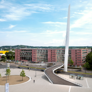 | Projekt: | Die Brücke ist als eine zweifach geschwungene Hängebrücke entwickelt und überquert über zwei 18 Grad geneigte Rampen in einem S-förmigen Schwung die Krefelder Straße. Die Rampe auf der Seite der Stadien weitet sich fächerförmig auf und leitet Fußgänger und Radfahrer zu den Sportstätten und zum Naherholungsgebiet in der Soers. |