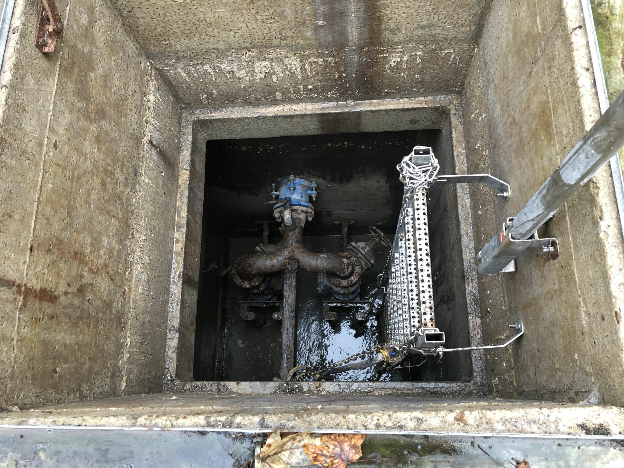 Die bestehende nassaufgestellte Pumpentechnik wurde zuletzt vor mehr als 10 Jahren erneuert und machte zunehmend Probleme. Eine Ausfallsicherheit konnte nicht mehr garantiert und Wartungsarbeiten nur mit erhöhtem Aufwand und Gefahren für das Betriebspersonal durchgeführt werden. Die Schachtöffnung befand sich nicht so über den Pumpen, dass diese gefahrlos gezogen werden konnten und die Schachtausrüstung gewährleistete kein sicheres Arbeiten. Der Zulauf DN 1000 war für Wartungsarbeiten nicht abzuschiebern und die abgehende PE-Druckleitung bewegte sich deutlich bei Druckstößen. Deshalb wurde vom Betriebspersonal bereits vor einiger Zeit ein Kantholz als provisorische Strebe nachgerüstet, die bei den Arzfeldern mittlerweile Kultstatus erreicht hat.