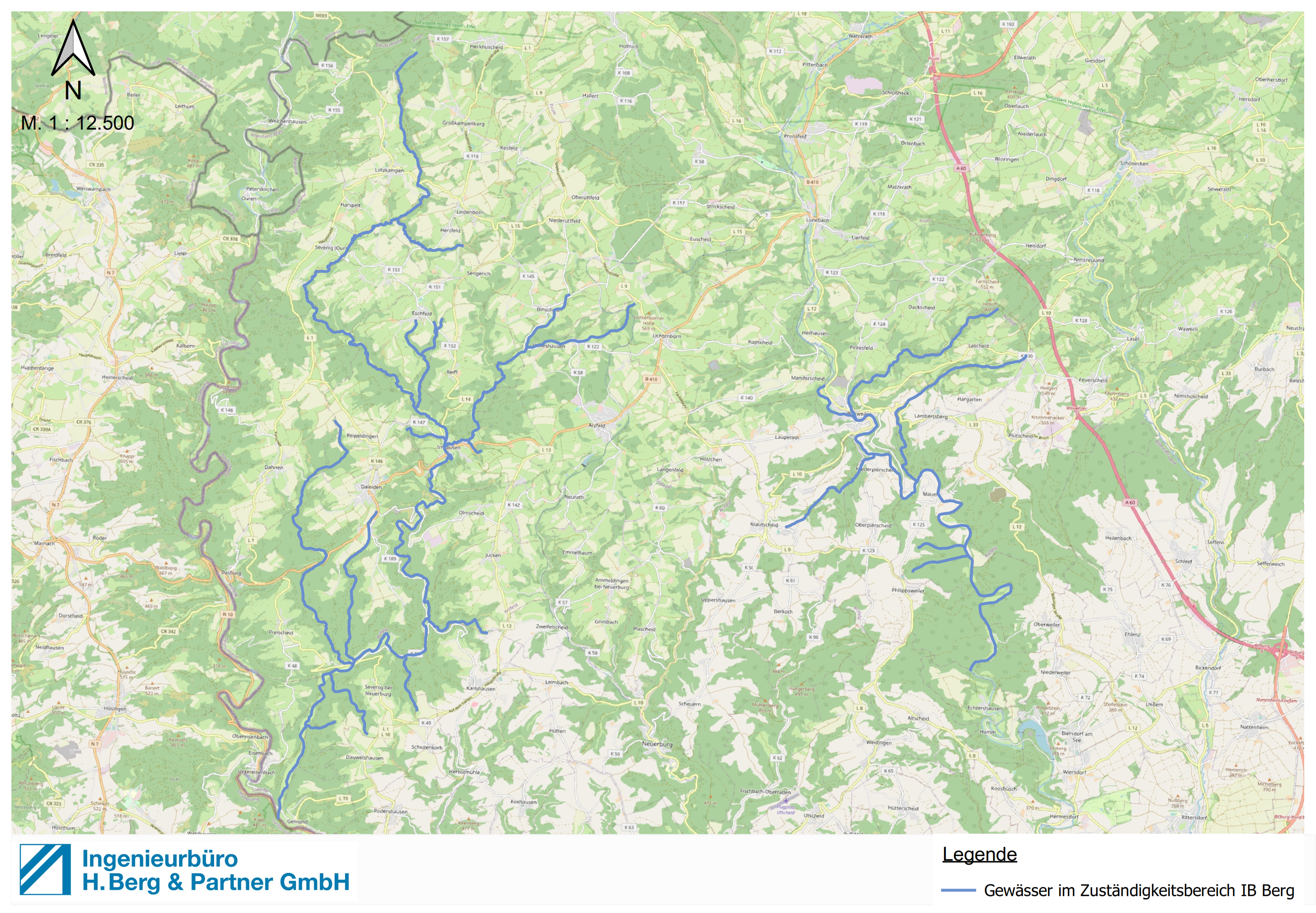 Im Zuständigkeitsbereich des IB Berg liegen 22 verschiedene Gewässer mit einer Lauflänge von ca. 112 km, darunter die Gewässer II. Ordnung Prüm und Irsen.