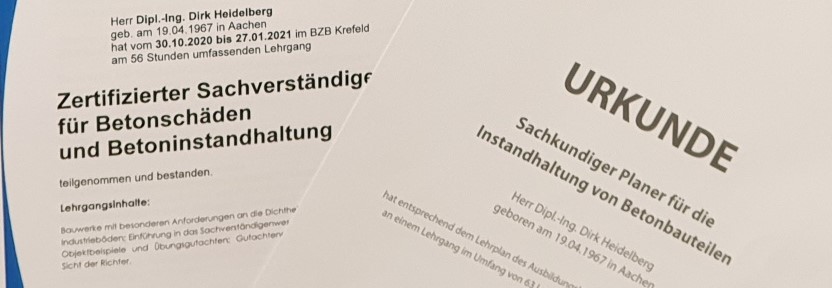 Nachdem Dirk Heidelberg zunächst im Oktober den Lehrgang zum Sachkundigen Planer (SKP) für die Instandhaltung von Betonbauteilen erfolgreich absolviert hatte, setzte er im Dezember noch einen drauf und qualifizierte sich in ebenfalls ca. 60 Stunden umfassenden und von der Ingenieurkammer Bau NRW anerkannten Lehrgang am Bildungszentraum des Baugewerbes e.V. (BZB) in Krefeld zum Zertifizierten Sachverständigen für Betonschäden und Betoninstandhaltung.