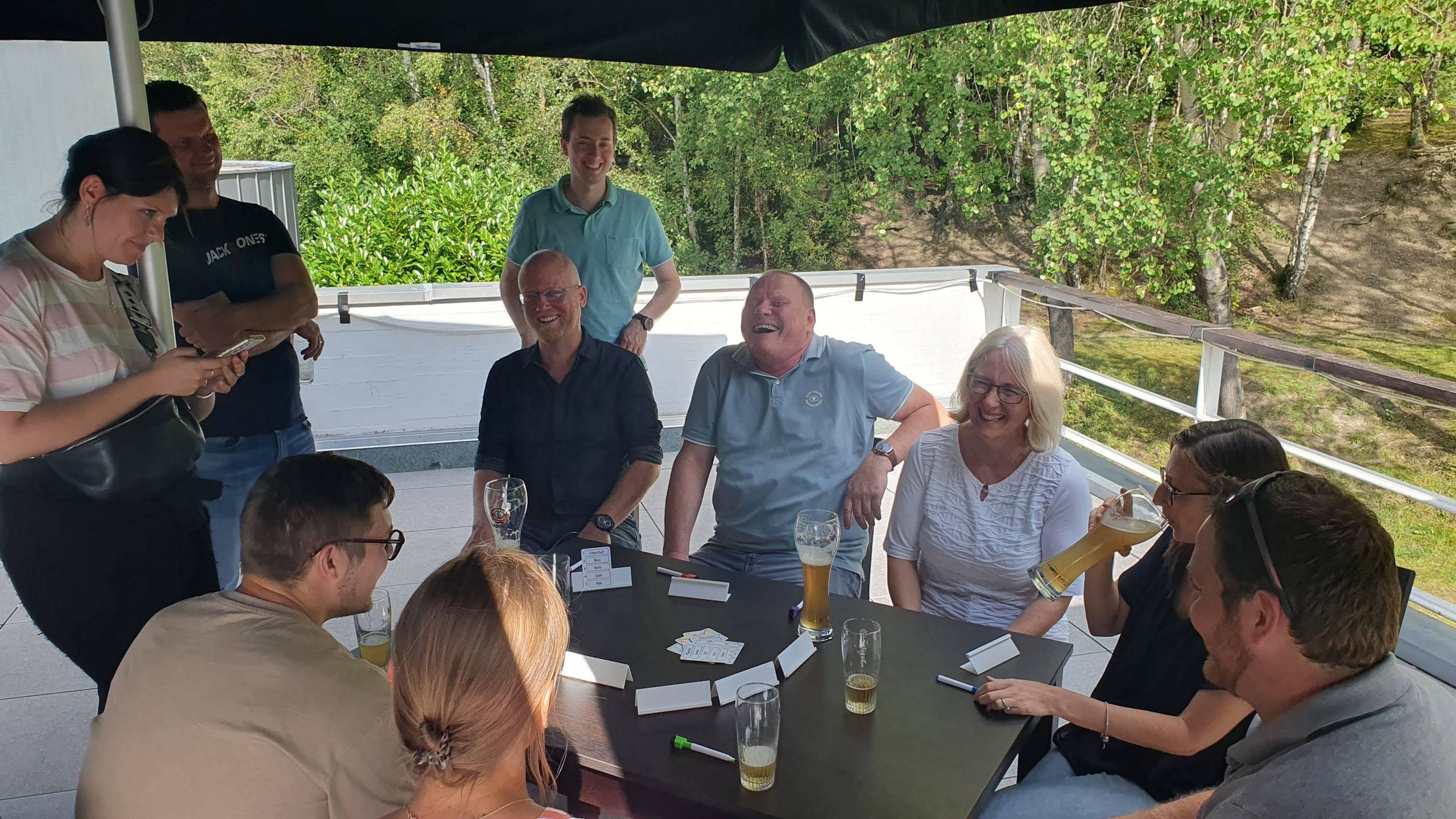 Teilweise etwas erschöpft vom vielen Treppensteigen versammelten wir uns zum Verschnaufen gegen Mittag wieder in den großzügigen Räumlichkeiten oberhalb des Talsperren-Restaurants. Während einige noch nicht genug Bewegung hatten und zu einer kleinen Wanderung aufbrachen, machten es sich andere mit einem warmen ☕ oder kühlen Getränk 🍻🍹auf der Terrasse gemütlich. Die von unseren luxemburger Kollegen mitgebrachten Gesellschaftsspiele 🃏 trugen hier maßgeblich zu einer ausgelassenen Stimmung bei, brachten aber auch die grauen Zellen auf Trab und zeigten dem einen oder anderen die Flexibilität, aber auch die Tücken, der deutschen Sprache auf (insbesondere unseren nicht muttersprachlichen Kolleg*innen )
