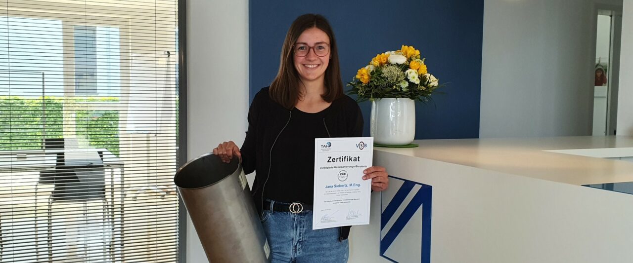 Wir freuen uns daher sehr, dass Jana Siebertz am 29.04.2022 die Prüfung zur Zertifizierten Kanalsanierungs-Beraterin mit Bravour bestanden hat. Herzlichen Glückwunsch, Jana!