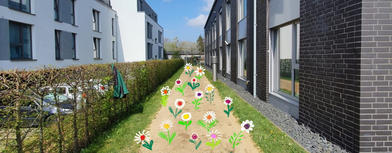 Hier soll statt des ökologisch wenig wertvollen Rasens eine bunte Wildblumenwiese entstehen. Viele Insekten und andere Tierarten leiden im städtischen Bereich v.a. durch zunehmende Versiegelung und den unsäglichen Trend zum Schottergarten gepaart mit exotischen und für Insekten uninteressanten Pflanzen unter der Abnahme eines ausreichenden Nahrungsangebotes. Dem möchten wir mit einer Blühwiese aus heimischen Arten wie z.B. gewöhnlicher Schafgarbe, Wiesen-Kerbel, Kornblume, Wilde Möhre, Klatschmohn, dem Berg-Sandglöckchen :-), uvm. ein wenig entgegenwirken.