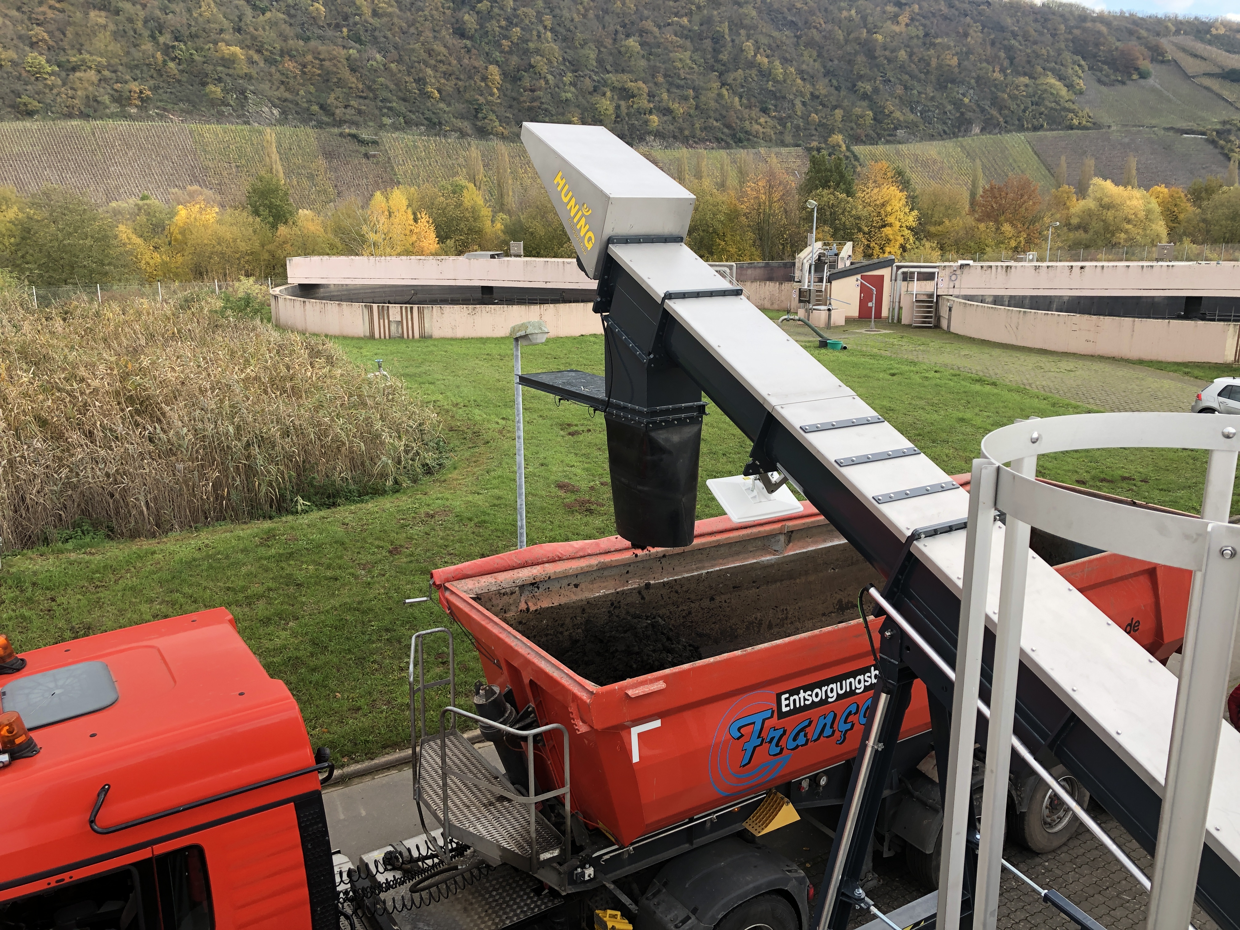 Entscheidender Bestandteil der Anlagen sind die beiden Schlammverladesysteme. Darin können 64 m³ entwässerter Schlamm zwischengelagert und vollautomatisch auf LKW verladen werden. Die Container stehen auf Wiegezellen, sodass sich das Verladegewicht genau einstellen lässt. Nach 30 Minuten sind 25 Tonnen geladen und der LKW ist wieder vom Gelände. Dabei kann jede Art von LKW beladen werden. Der Personaleinsatz ist minimal und der LKW-Fahrer kann mit einem Tablet und einer Kamera am Entwässerungsgebäude aus dem Führerhaus beobachten, wie sich die Schüttkegel im Auflieger aufbauen und wann vorgezogen werden muss.