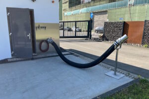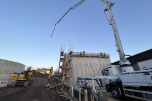 Ein besonderer Moment in der Bauphase war die erste Abholung von entwässertem Klärschlamm durch einen großen Sattelzug. Nach einem kurzen Moment des Bangens haben wir beruhigt und mit wohlwollender Zufriedenheit seitens des AG festgestellt, dass auf unsere Planung und Bauleitung Verlass ist und der große LKW die Einfahrt perfekt passieren kann.