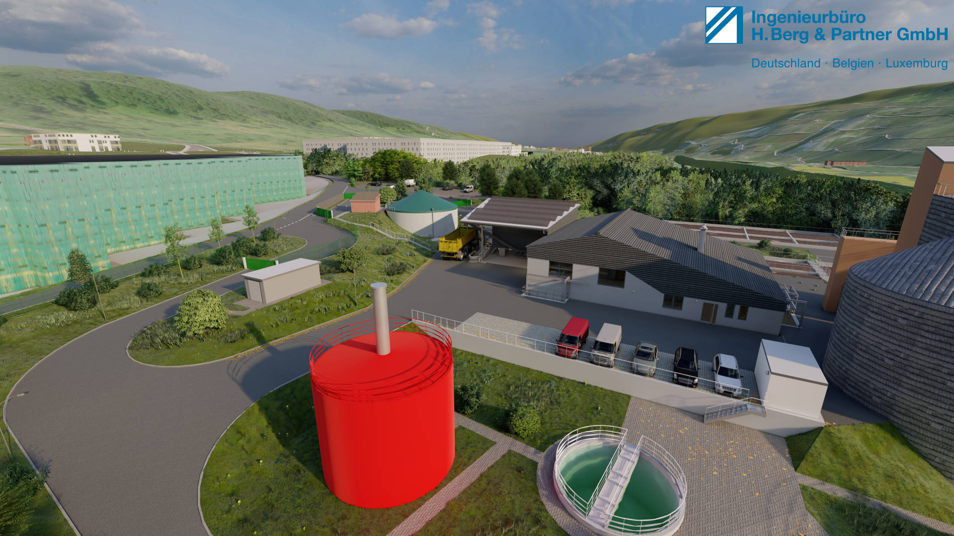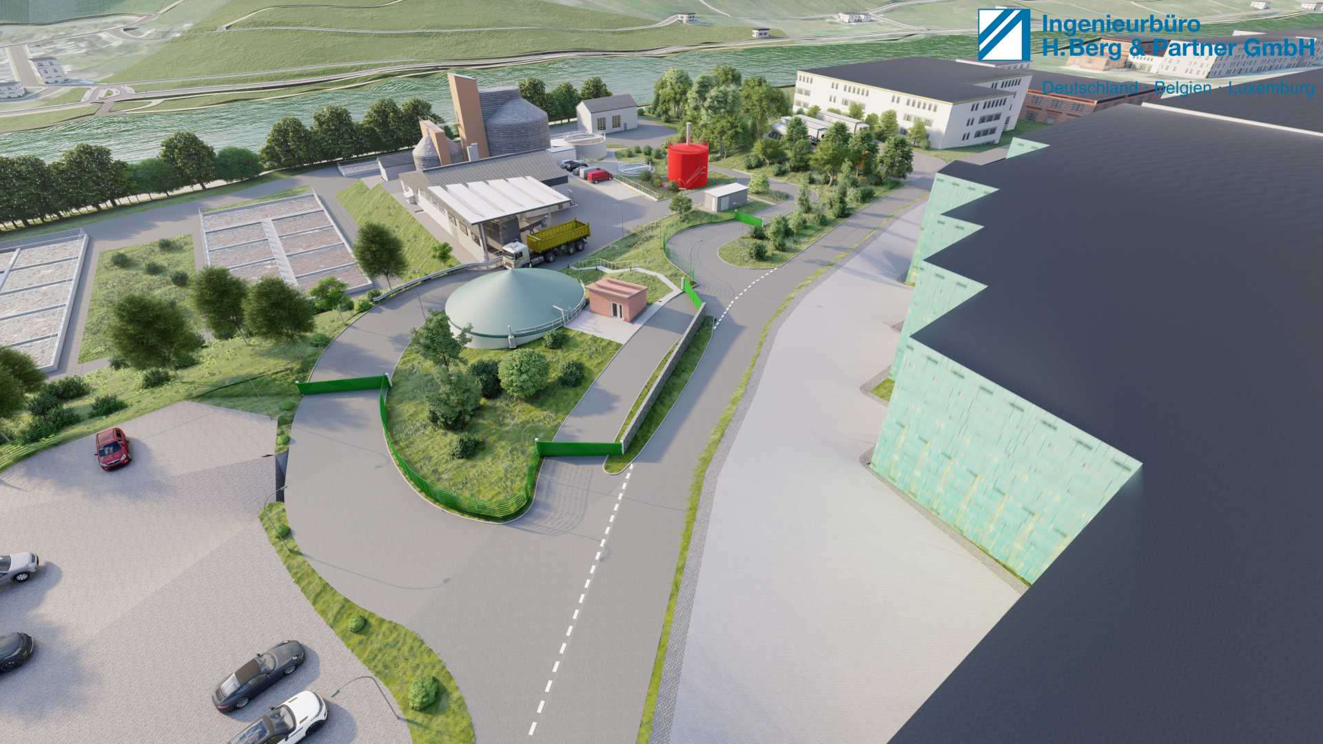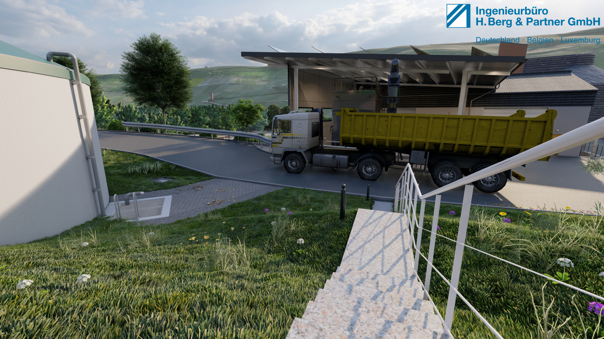Getreu dem Motto „Dem Ingenör ist nix zu schwör!“ wurde lange getüftelt, bis sich der Umbau optimal in die vorhandene Umgebung einpasst. Dabei wird das stark abfallende Gelände hin zur Mosel genutzt, um Annahmestation und Schlammspeicher hydraulisch günstig zu positionieren. Die offene Halle neben dem Betriebsgebäude wird als Pultdach mit Ausrichtung Süd-Ost ausgeführt und mit PV-Elementen zur Erhöhung der Eigenstromdeckung belegt. Passend zum anstehenden Umbau der angrenzenden Straße „Bornwiese“ wird das Gelände mit einem Doppelstabgitterzaun und einer Gabionenwand abgetrennt. Die Böschungen werden mit Gras- und Blütenmischungen eingesät und heimische bodentiefe und mittelhohe Pflanzen platziert.