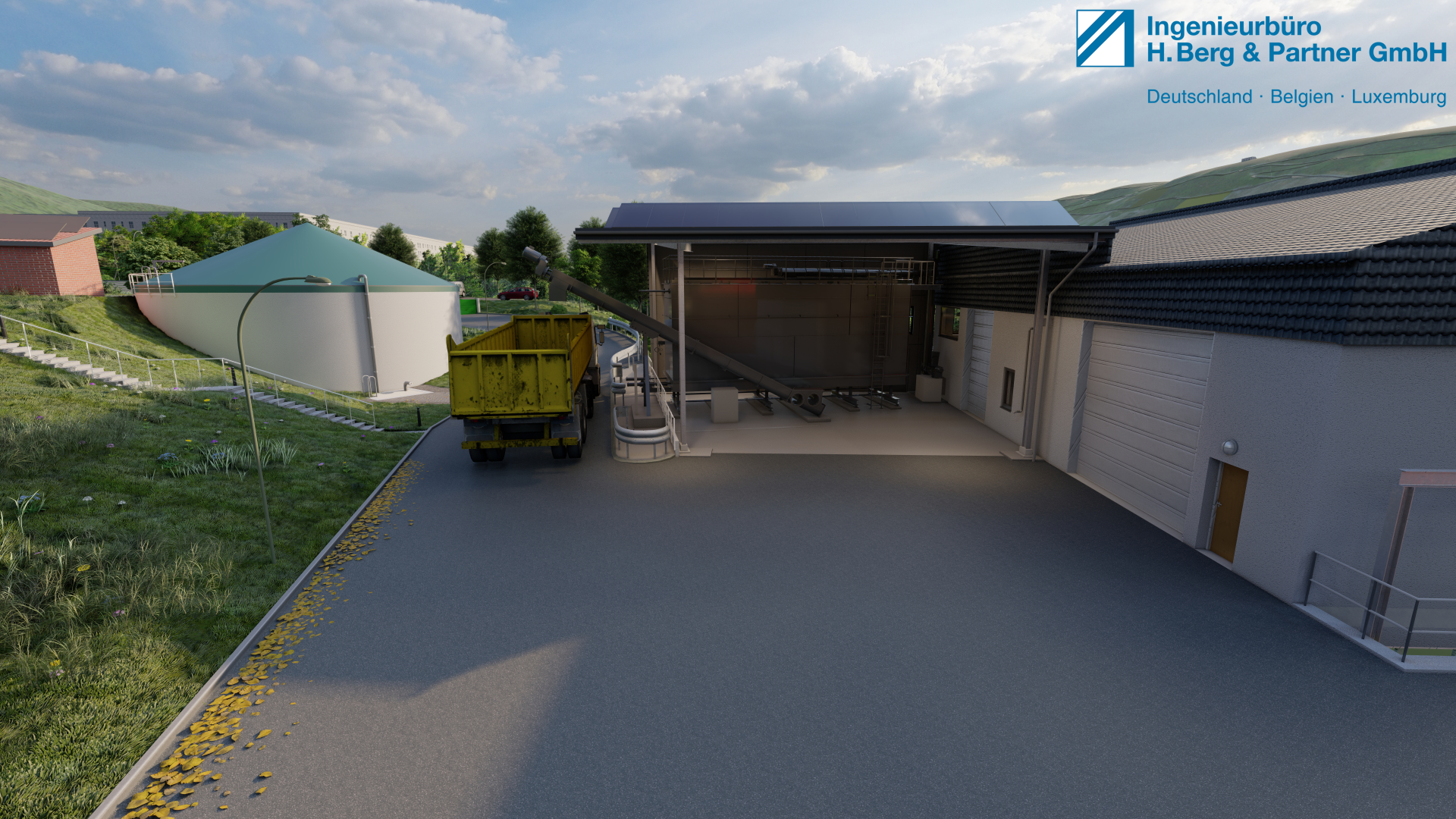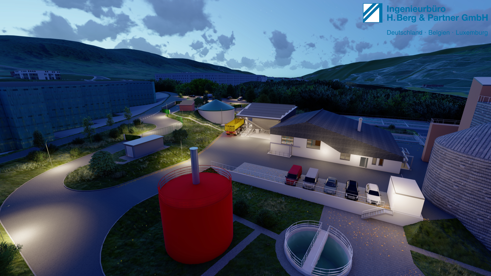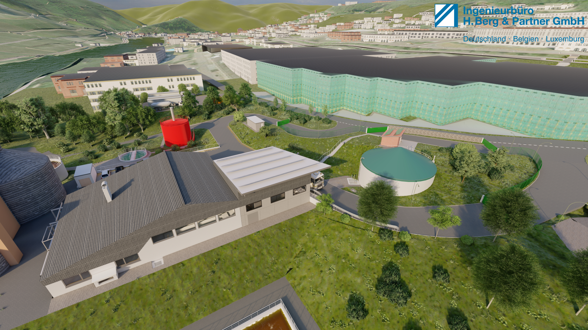 Getreu dem Motto „Dem Ingenör ist nix zu schwör!“ wurde lange getüftelt, bis sich der Umbau optimal in die vorhandene Umgebung einpasst. Dabei wird das stark abfallende Gelände hin zur Mosel genutzt, um Annahmestation und Schlammspeicher hydraulisch günstig zu positionieren. Die offene Halle neben dem Betriebsgebäude wird als Pultdach mit Ausrichtung Süd-Ost ausgeführt und mit PV-Elementen zur Erhöhung der Eigenstromdeckung belegt. Passend zum anstehenden Umbau der angrenzenden Straße „Bornwiese“ wird das Gelände mit einem Doppelstabgitterzaun und einer Gabionenwand abgetrennt. Die Böschungen werden mit Gras- und Blütenmischungen eingesät und heimische bodentiefe und mittelhohe Pflanzen platziert.