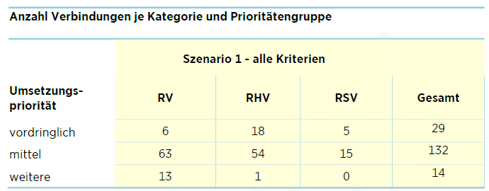 Von besonderer Bedeutung ist auch die Priorisierung aller Verbindungen aus dem RRWN-Konzept. Dazu wurde eine Nutzwertanalyse durchgeführt, anhand derer wiederum ein kategorisiertes Priorisierungsergebnis ermittelt wurde.