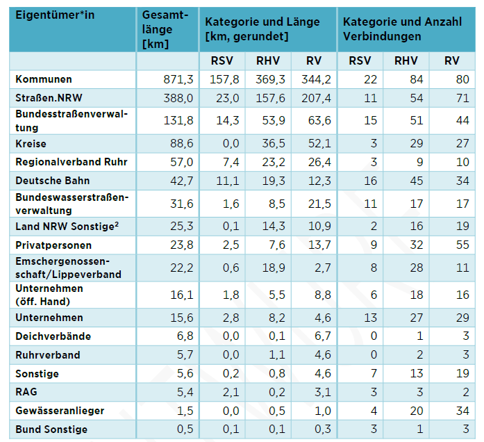 Das Umsetzungskonzept nimmt dabei eine regionale Perspektive ein und betrachtet jeweils die vollständigen Verbindungen von Ort zu Ort. Die Ergebnisse dienen als Orientierung für die Kommunen und weitere zuständige Baulastträger, für den RVR stellen sie eine wichtige Entscheidungsgrundlage für die Umsetzungsreihenfolge der RVR-eigenen Radwegeprojekte dar.