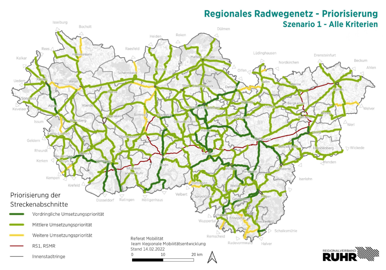 - Kategorisierte Priorisierung aller Radwege aus dem RRWN-Konzept in zwei Szenarien